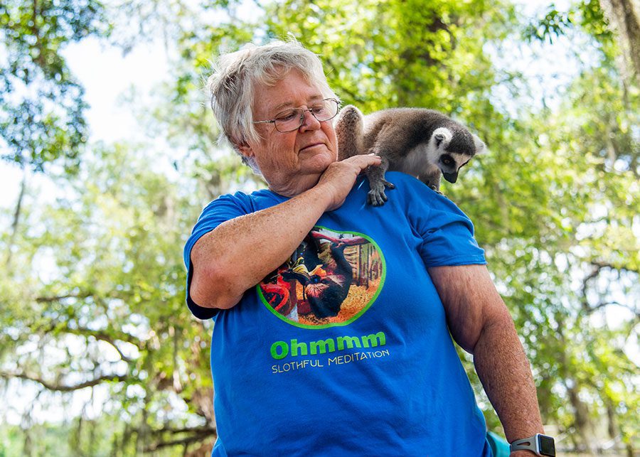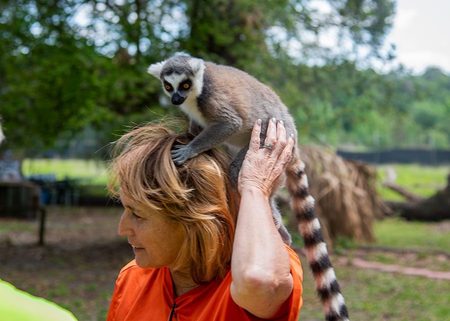 Julie says practicing yoga outside among nature, and with the lemurs, takes the experience to a whole other level. She also says before she started teaching at Chase, she’d heard of goat, cat, alpaca and even dog yoga, but never yoga with lemurs.
