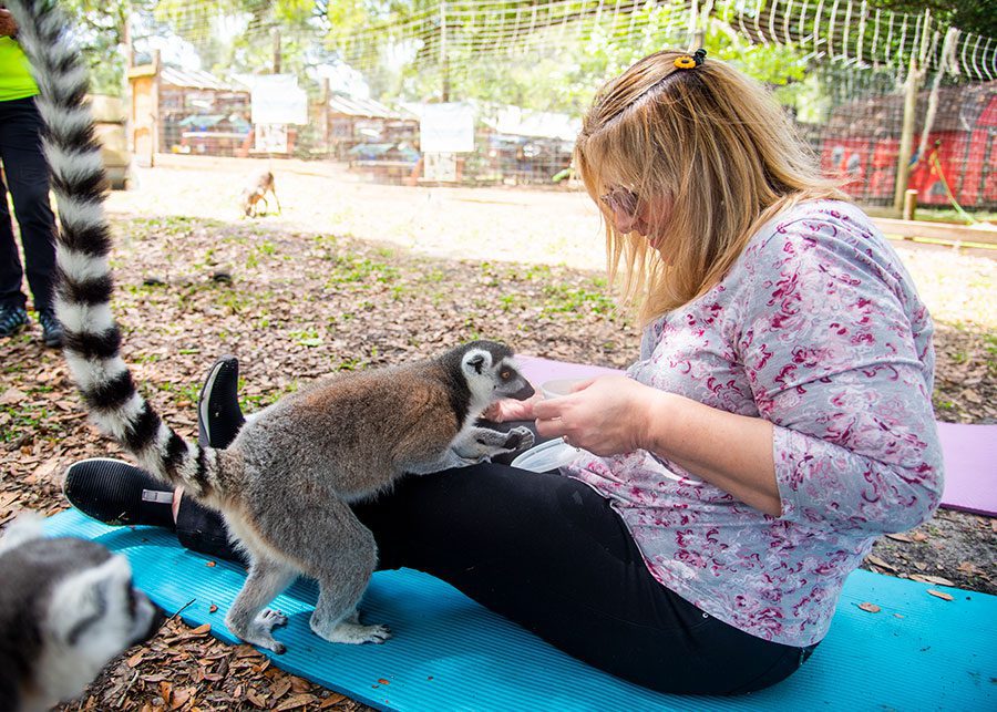 “Nobody knows each other, everyone’s at their own level of yoga, but the lemurs bond the class together,” Julie says. “The lemurs add so much to the experience and there’s nothing like it, unless you go to Madagascar or something. You’ll go home and talk for hours about your experience with these cute, curious, soft, funny little animals.”