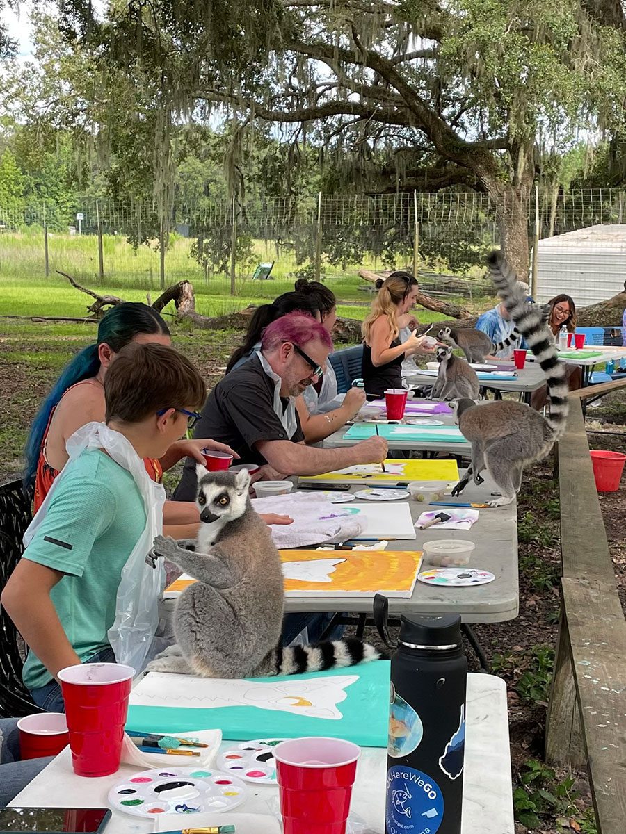 Other classes/events Chase Rescue now offers include Painting with Primates, a class that allows students to sit outside in nature, and paint on a canvas, while a docile family of Ruffed Lemurs plays all around them, and if lucky, add paw prints to their masterpieces, and Acoustics in the Afternoons, a gathering where people join the lemurs outside under the the grandfather oaks at the facility for a laid back concert put on by local musicians.