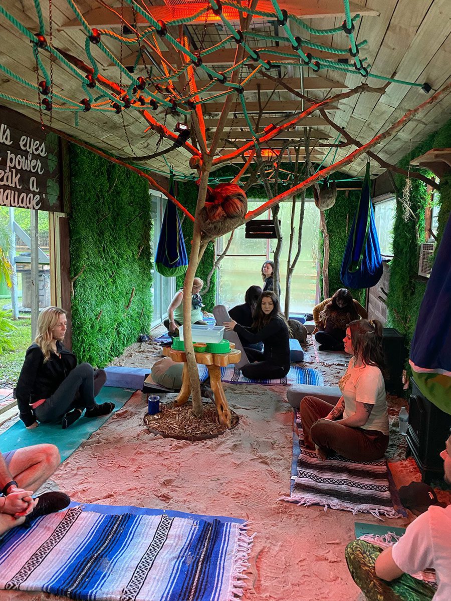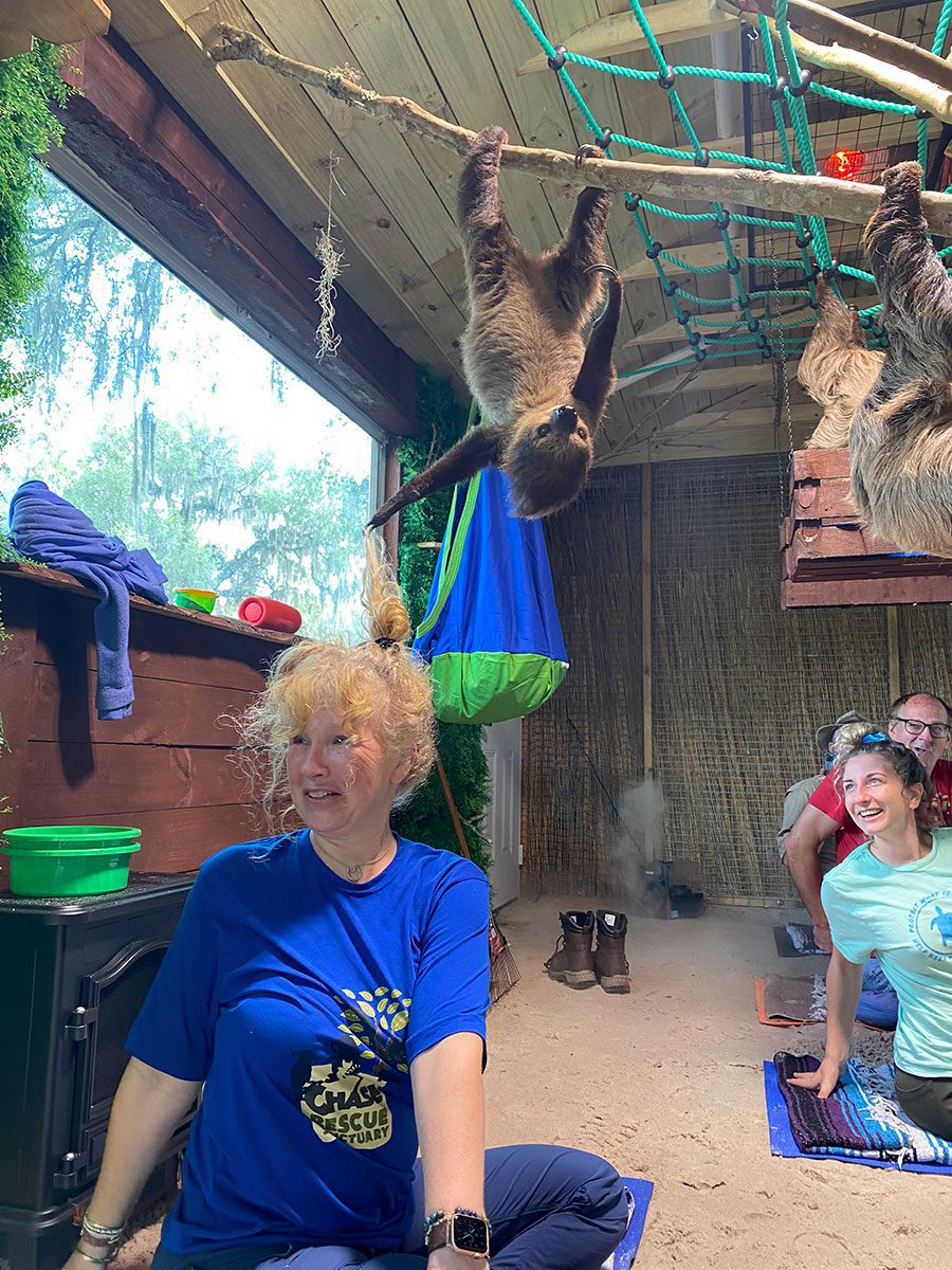 The one-hour classes, offered twice a month on Saturday mornings, are held inside the sloth enclosure built specifically to simulate their natural habitat, right down to the tropical temperatures required by Chase’s two resident sloths: Seymour and Sang Mu, both rescues brought to the facility when the people who had them as pets could no longer care for them.
